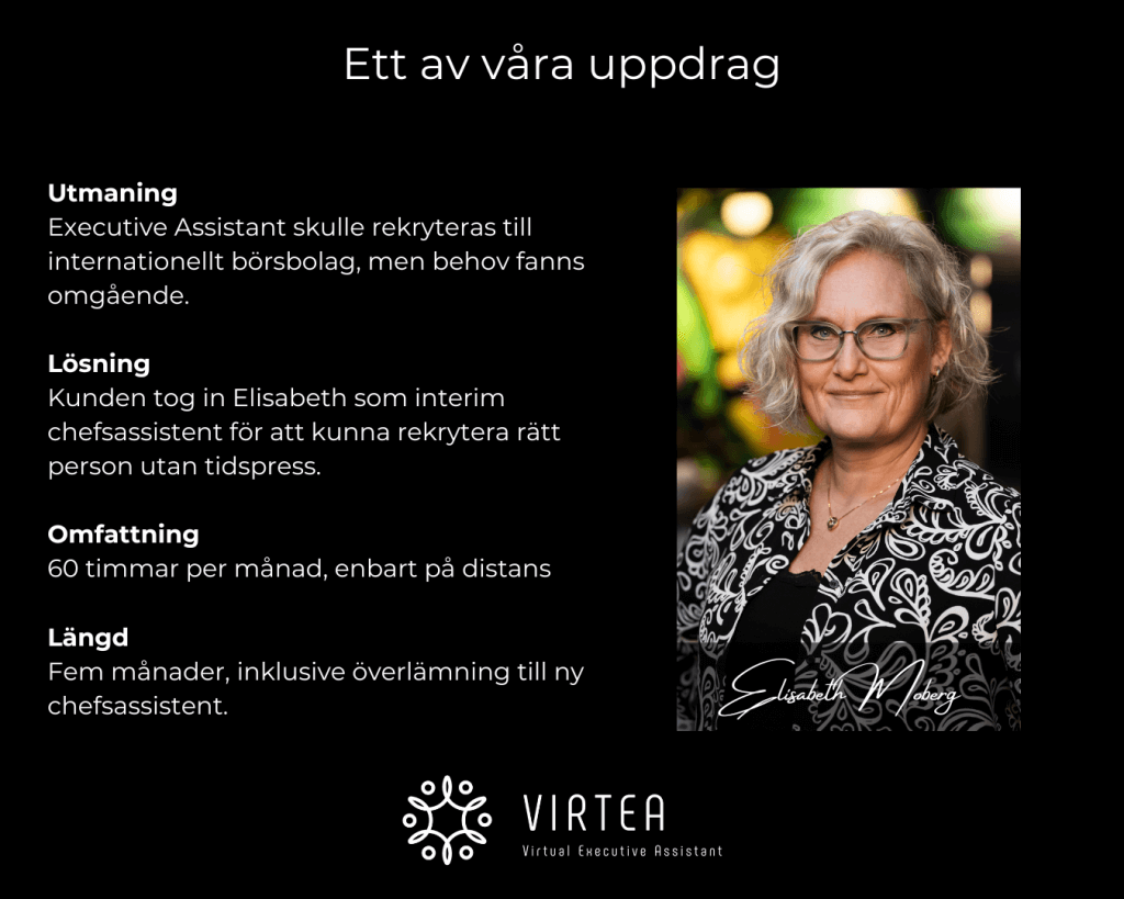 - Rätt person – Ett interimuppdrag kräver oftast att man är lite mer erfaren. Kunden har inte tid och lust att lära upp och handleda någon som bara ska vara hos dem ett tag. Hos Virtea är alla erfarna chefsassistenter från stora bolag som har förståelse för både C-suite och hög sekretess. ”We hit the ground running” som våra engelsktalande vänner skulle säga.